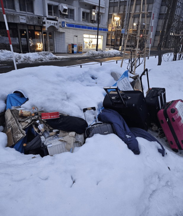 根據(jù)日本網(wǎng)民在社交平臺(tái)X分享的照片,地點(diǎn)證實(shí)為札幌創(chuàng)成川公園,在一片雪地上,堆滿了游客的行李箱,有大有小,彷如一個(gè)小型旅行團(tuán)集體丟棄。此外,行李箱堆上亦滿布垃圾,有空汽水樽、餅罐、紙皮箱禾膠紙卷等,十分影響市容。