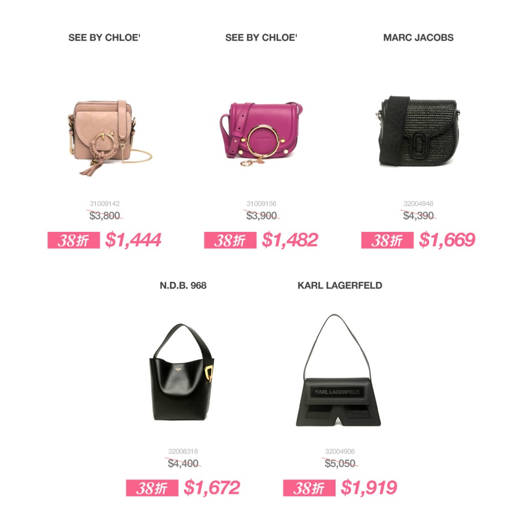部分優(yōu)惠熱賣(mài)商品包括GUCCI 經(jīng)典圖案肩背包,原價(jià)$26,000,現(xiàn)售$9,880;VALENTINO 高雅米黃色托特包,原價(jià)$15,000,現(xiàn)售$5,700;MARC JACOBS 經(jīng)典黑色手袋,原價(jià)$4,390,現(xiàn)售$1,669;SEE BY CHLOé 粉色小巧手袋,原價(jià)$3,800,現(xiàn)售$1,444等等。所有參與優(yōu)惠的商品數(shù)量有限,售完即止。