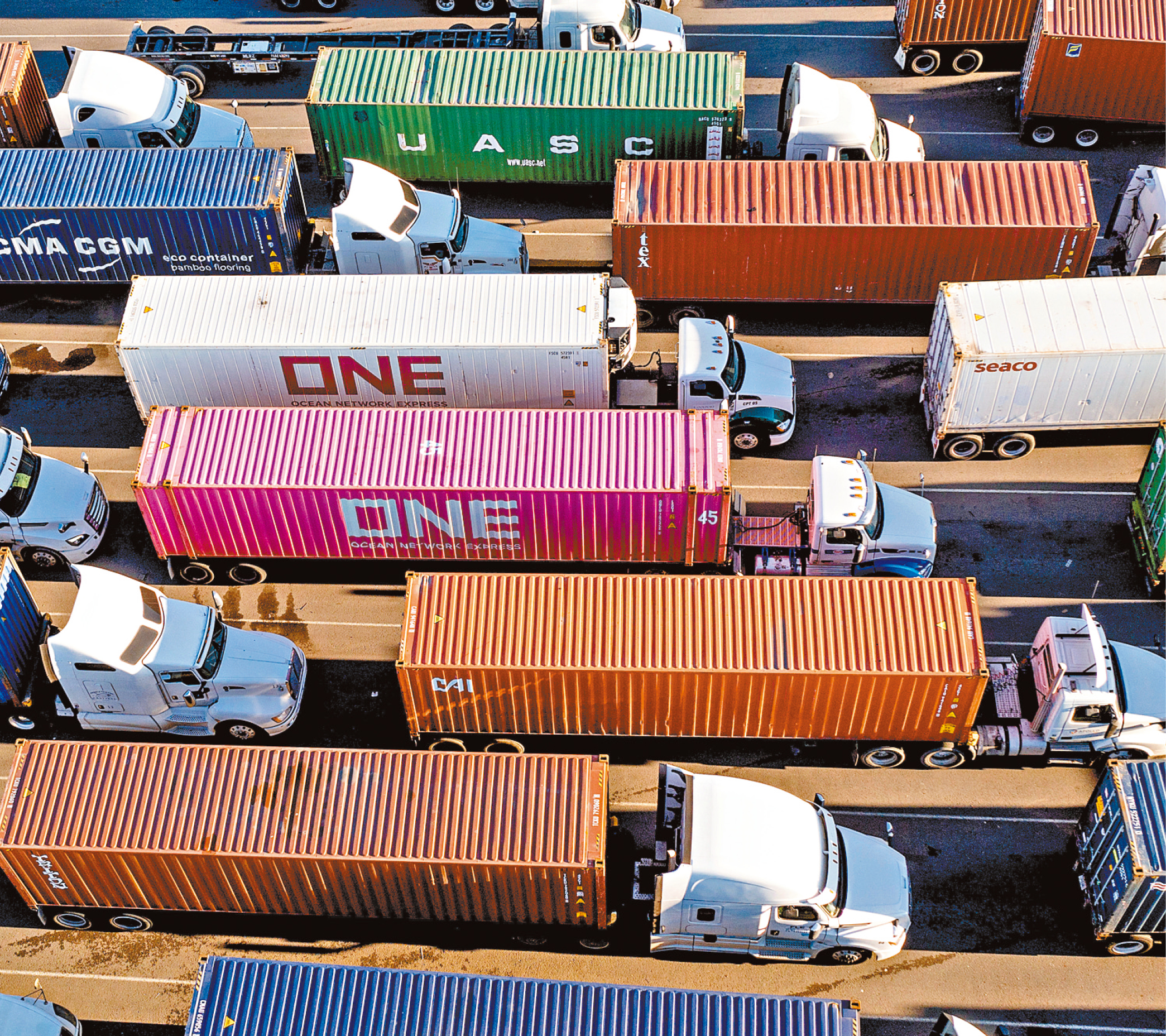 關稅戰(zhàn)開打勢必影響民生。圖為貨車排隊進入屋侖港口。美聯(lián)社資料圖片