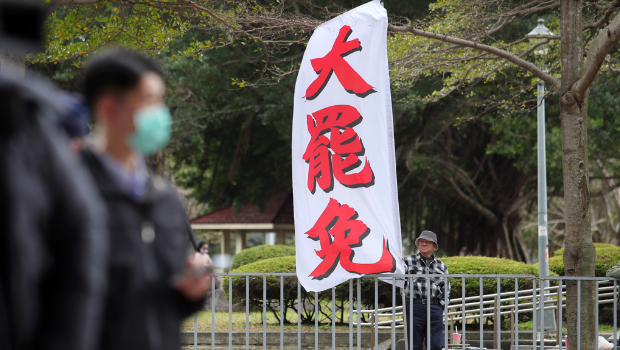 圖為民眾在民進黨中央黨部樓下高舉旗幟,要求黨主席賴清德對大罷免表態(tài)。