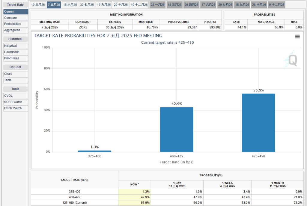 ▲FedWatch顯示,市場預期聯(lián)儲局5月減息的機率,已急升至逾四成。