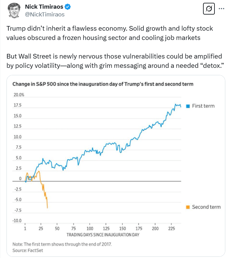 有“聯(lián)儲局線人”之稱的《華爾街日報》Nick Timiraos指出,美國政府過去一直為經濟“軟著陸”下苦功,力求不引發(fā)經濟衰退下降低通脹,但直至今年,特朗普團隊已多番表示,對于關稅政策導致投資風險毫不關心,亦認為一些開支及招聘要進行“排毒”,短期內通脹亦將上升。