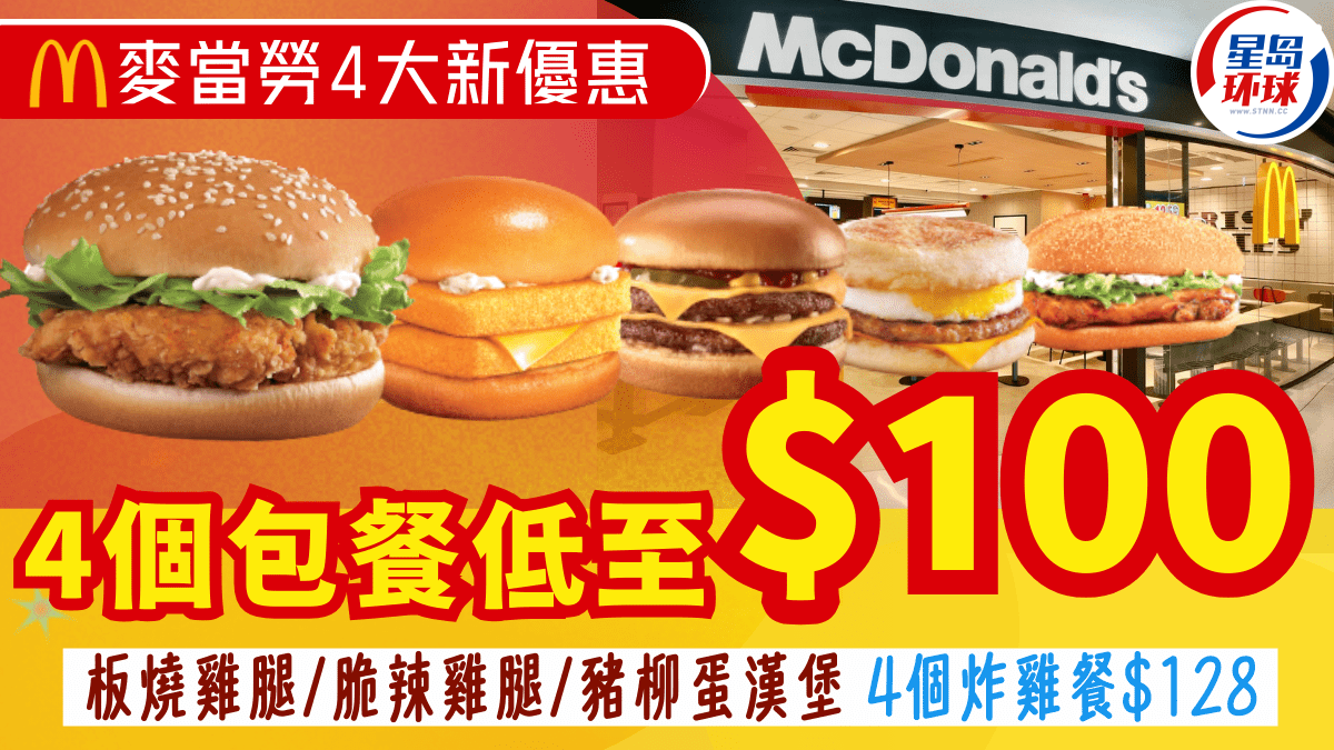 “飽你鍾意套餐”優(yōu)惠$100起,可自選4個包餐,包括板燒雞腿飽、脆辣雞腿飽及豬柳蛋漢堡套餐,另加$6可升級至雙層魚柳飽及雙層芝士孖堡套餐。