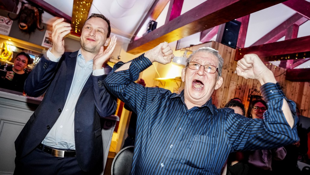 格陵蘭選舉結(jié)束,民主黨(Demokraatit)黨魁尼爾森(左)慶祝勝選。 美聯(lián)社