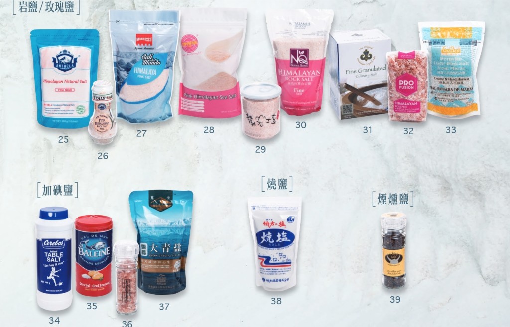 消委會曾經(jīng)檢測市面上39款預先包裝食鹽樣本,包括4款餐桌鹽/烹調(diào)用鹽、19款海鹽、1款湖鹽、9款巖鹽/玫瑰鹽、4款加碘鹽、1款燒鹽和1款煙熏鹽。樣本價錢介乎2.6至440港元之間。