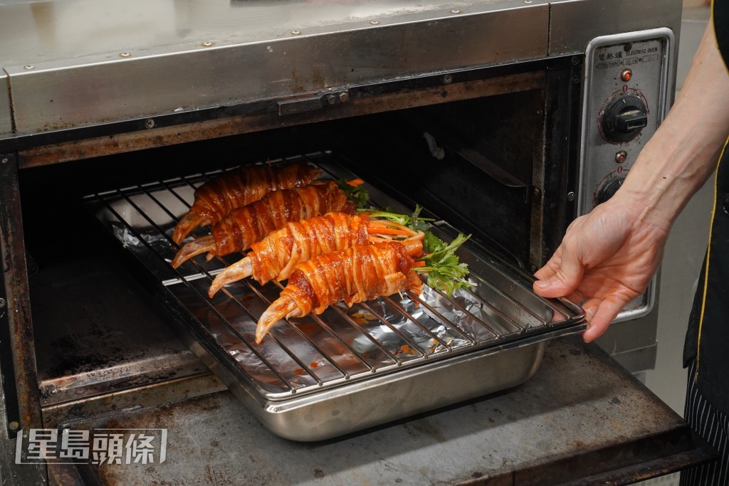 雞翼。雖是普通食材,但要烹飪富特色的雞翼料理,便要花心思及具技巧。以炮制醬烤鳳翼卷為例,雞全翼起骨時要避免戳穿雞皮,用五花腩片包裹雞翼要注意位置、力度及如何固定收口,這些都是菜式成敗的關(guān)鍵。