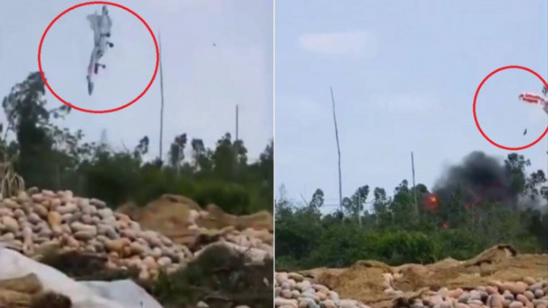 網(wǎng)上有影片流傳,顯示失事的戰(zhàn)機在空中失控,機師彈射逃生,戰(zhàn)機呈九十度垂直姿態(tài),直插落地面,隨即爆炸,冒出巨型火球。成功跳傘的機師,則獲當?shù)卮迕窬戎?,神智清醒由居民扶著離開。