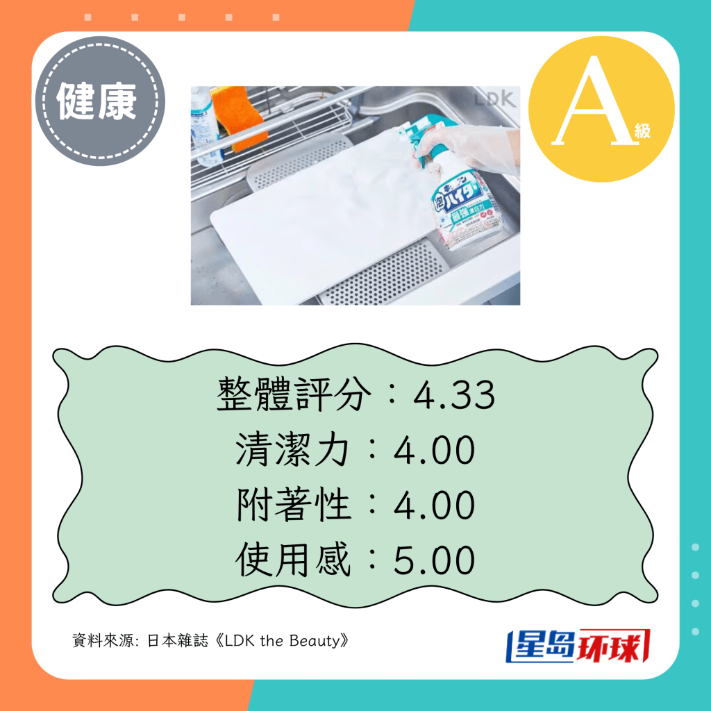 第1位(4.33分):KAO花王廚房除菌漂白泡沫噴霧清潔劑(日圓¥345,約HK$18)