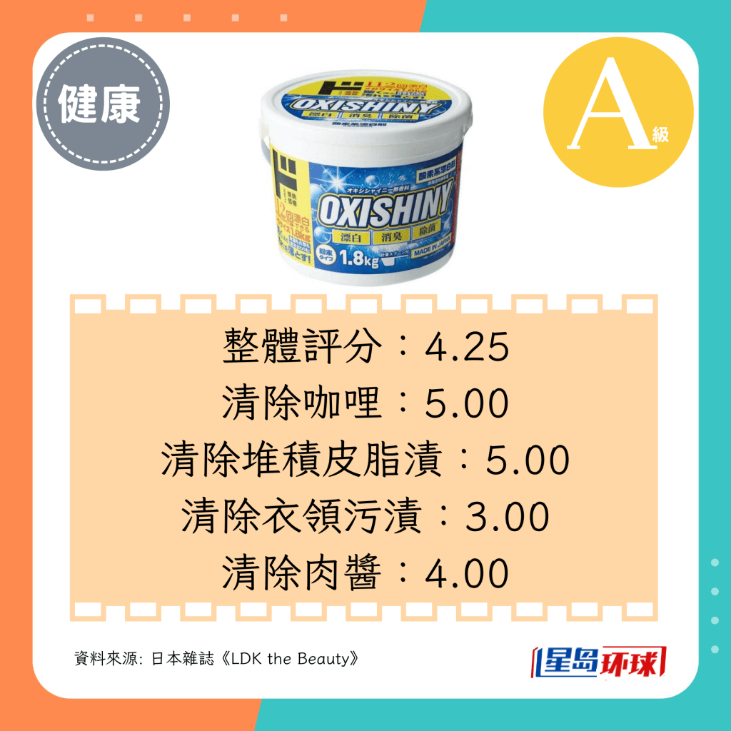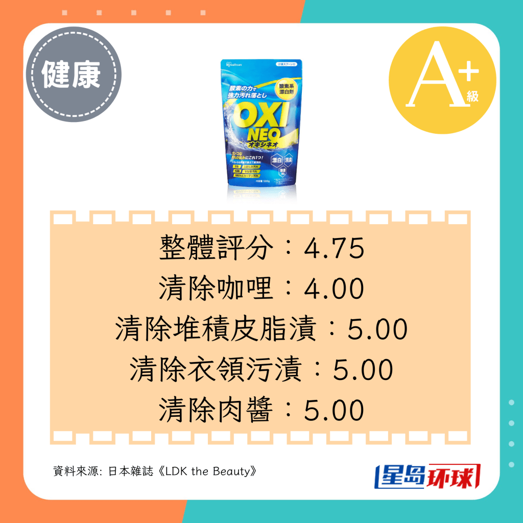 第1位(4.75分,A+級):IRIS OHYAMA OxiNeo粉末漂白劑(日圓¥798,約HK$42)