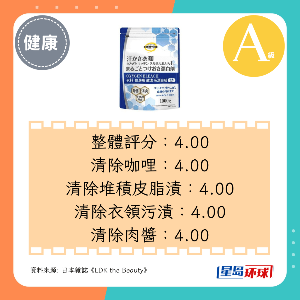 共同第3位(4.00分):CAINZ含氧漂白劑(過碳酸鈉)(日圓¥598,約HK$31)