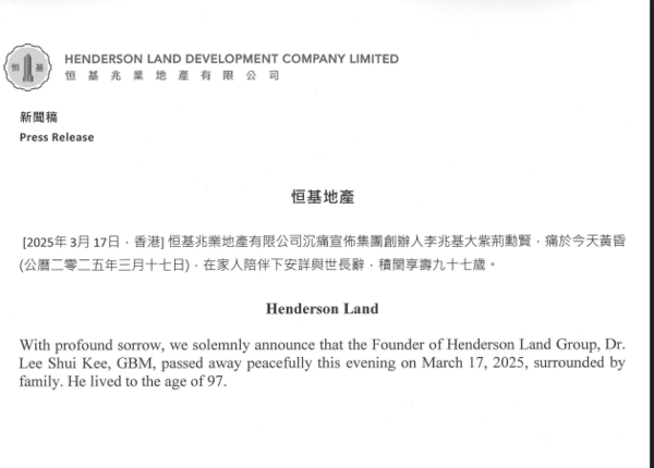 恒基兆業(yè)宣布,集團(tuán)創(chuàng)辦人李兆基于今天(17日)黃昏,在家人陪伴下安詳與世長辭,積閏享壽97歲。李兆基出殯儀式的舉行日期,一俟家族安排妥當(dāng)后,將會(huì)另行公布。