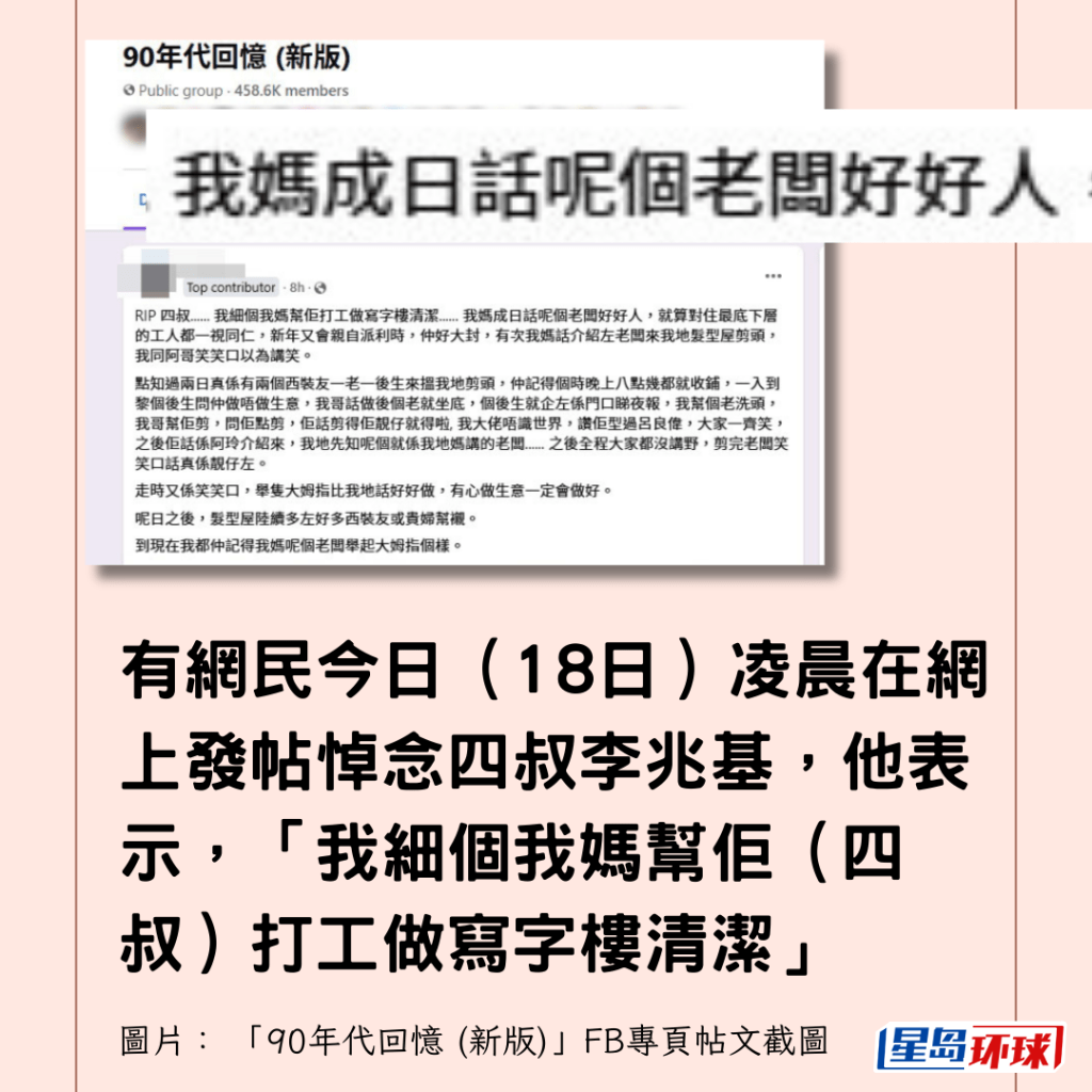 有網(wǎng)民今日(18日)凌晨在網(wǎng)上發(fā)帖悼念四叔李兆基,他表示,“我細個我媽幫佢(四叔)打工做寫字樓清潔”,“我媽成日話呢個老板好好人,就算對住最底下層的工人都一視同仁,新年又會親自派利時,仲好大封?!?/p>
