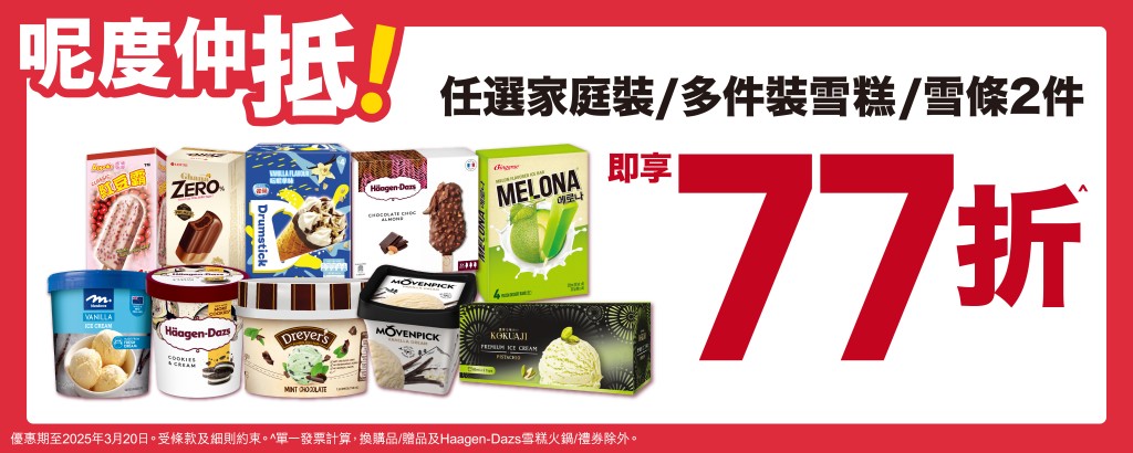 惠康優(yōu)惠|惠康超級市場驚喜優(yōu)惠不斷,于即日起至3月20日推出“雪糕感謝祭”,凡于惠康門市或網店購買任何家庭裝或多件裝雪糕或雪條2件,便可享有77折優(yōu)惠,以至抵價入手H?agen-Dazs、DREYER'S、MELONA等雪糕及雪條!
