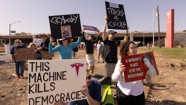 ▲2025年3月15日,美國德州奧斯汀市的特斯拉展間,民眾抗議馬斯克。(路透社)