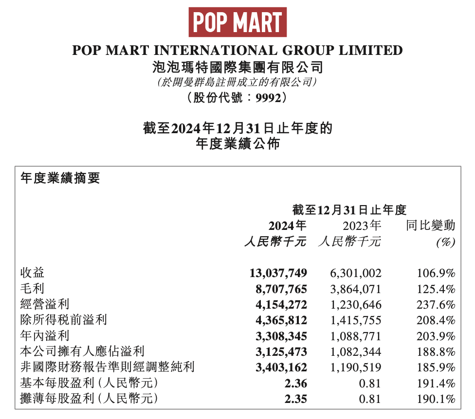 3月26日,泡泡瑪特發(fā)布截至2024年12月31日止年度的年度業(yè)績。