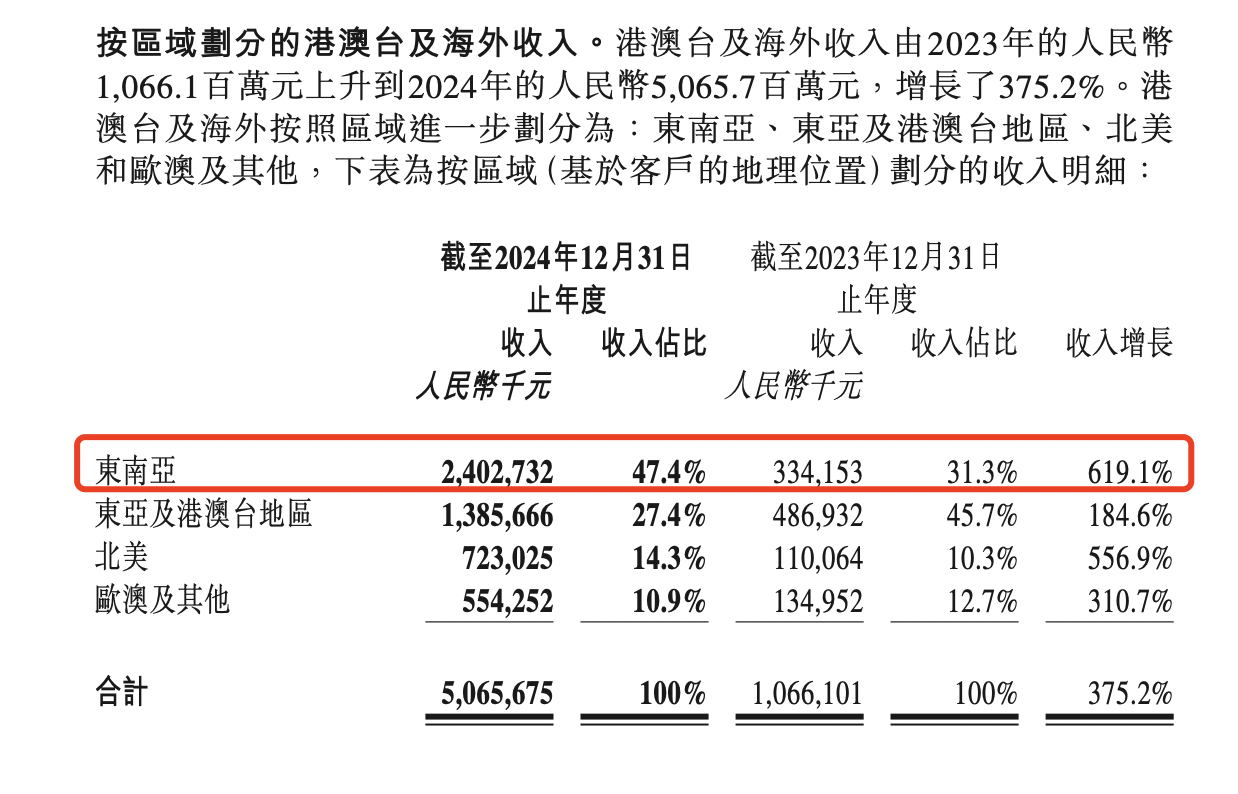 值得一提的是,東南亞市場收入24億元,在海外及港澳臺收入中占比47.4%,同比增長619.1%,是四大海外及港澳臺區(qū)域中收入占比最高以及業(yè)務增速最快的區(qū)域。