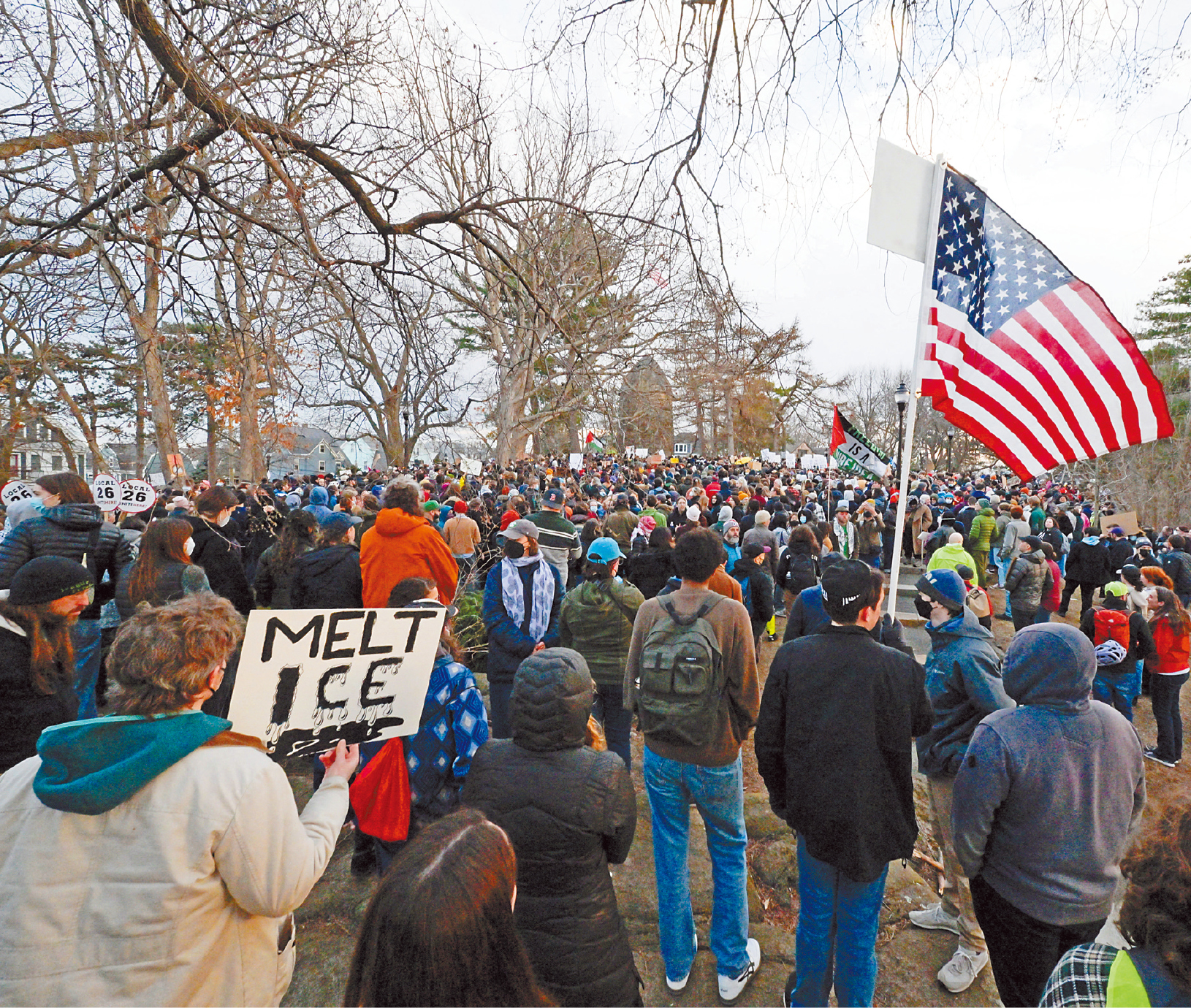美國擴大驅逐親巴勒斯坦留學生。圖為馬薩諸塞州民眾27日集會,抗議當局拘捕塔夫茨大學一名支持加沙巴勒斯坦人的土耳其博士生。路透社