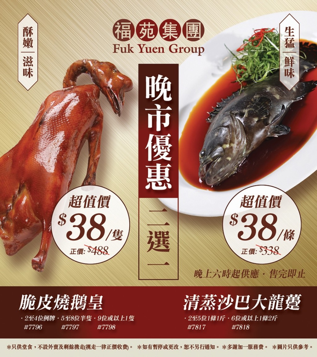 務求令食客留港消費,近年不少酒樓也出盡奇招,繼早前海港集團的$38燒鵝優(yōu)惠掀起熱潮后,另一香港連鎖酒樓集團“福苑”也于旗下柴灣、將軍澳、長沙灣分店推出燒鵝晚市優(yōu)惠,僅需$38即可享受原只脆皮燒鵝,不吃燒鵝也可選擇清蒸沙斑大龍躉,無論是肉食愛好者還是海鮮控,都能在此找到心頭好!