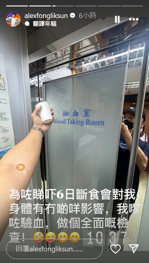 到翌日起床,方力申就現(xiàn)身于診所門(mén)外,原來(lái)他要驗(yàn)血:“為咗睇嚇6日斷食會(huì)對(duì)我身體有冇啲咩影響,我嚟咗驗(yàn)血,做個(gè)全面嘅檢查”于圖片所見(jiàn),戴上Cap帽、穿上藍(lán)色短Tee的方力申左前臂貼上膠布,已完成抽血進(jìn)程。