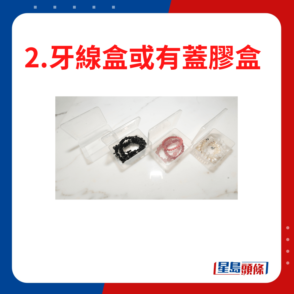 日常生活中常見的牙線盒或有蓋膠盒,其實是很好的飾物收納幫手,適合收納手鐲、頸鏈等。只要把印刷招紙撕起,可方便看清楚內(nèi)容及減低視覺混亂。這類膠盒棄掉前不妨先看看能否重用,不僅能省下額外開支,更能為環(huán)保出一分力。