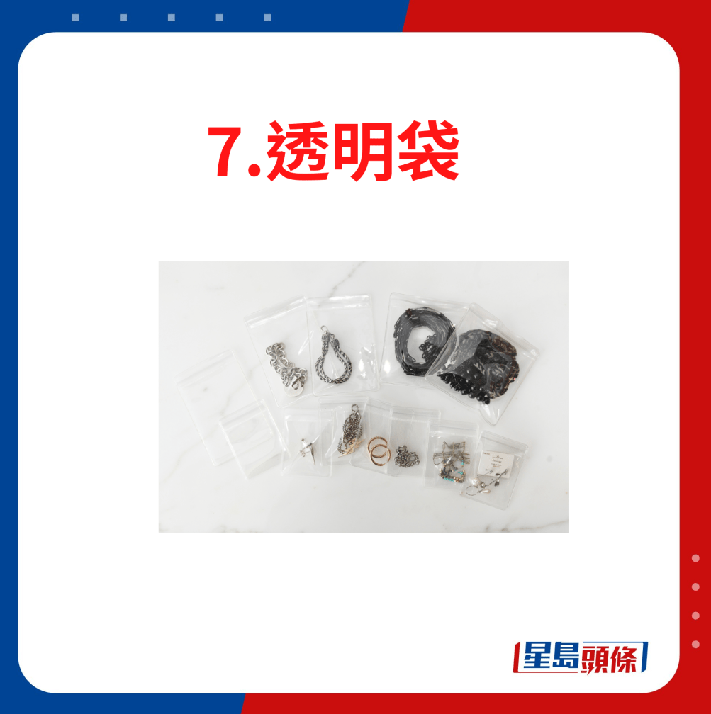 香港天氣潮濕,飾物容易氧化,正確收納可以延長飾物的壽命。把飾物放進透明袋能有效隔絕空氣,防氧化變黑之余,頸鏈類也不容易混雜其他飾物弄至打結(jié)。建議選擇厚身的透明袋,比較耐用。