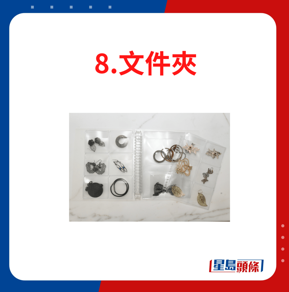 利用活頁文件夾收納飾品,能像瀏覽產(chǎn)品目錄一樣,一目了然。垂直放在書桌或梳妝枱前都不占空間,整齊又美觀。