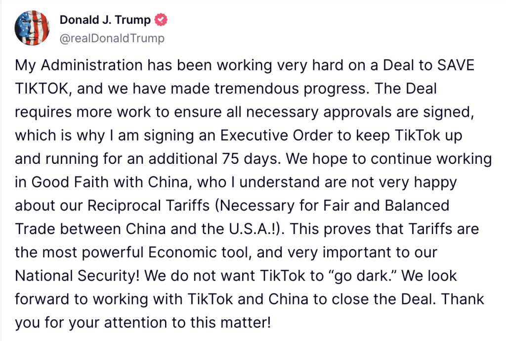 不過,在特朗普宣布征收對等關(guān)稅后,中國表示不會批準該交易,因此剝離TikTok美國資產(chǎn)的交易被擱置。特朗普于是在4日宣布延長TikTok禁令寬限期75天。