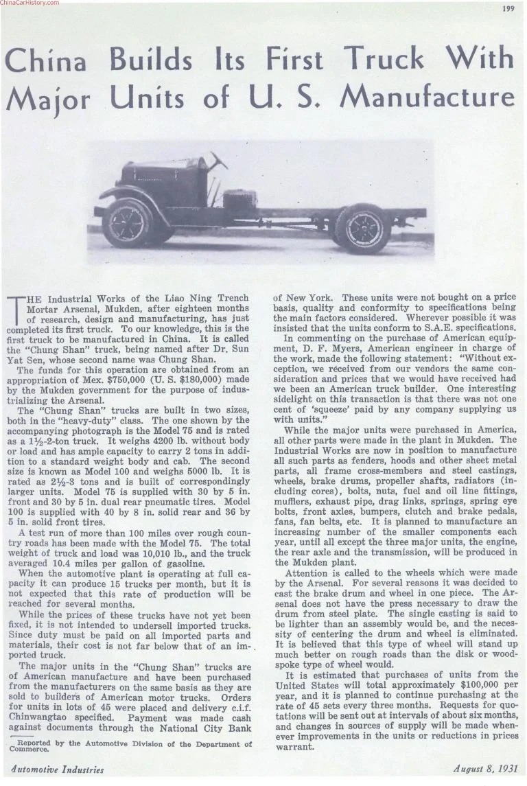 按照“先仿制后創(chuàng)新”計劃,民生工廠入口了一輛美國瑞雪號汽車,以逆向工程,在1931年5月31日,中國首輛汽車——民生75型載貨卡車正式下線,較更為國人熟悉的長春第一汽車制造廠CA10卡車誕生,早了足足25年。