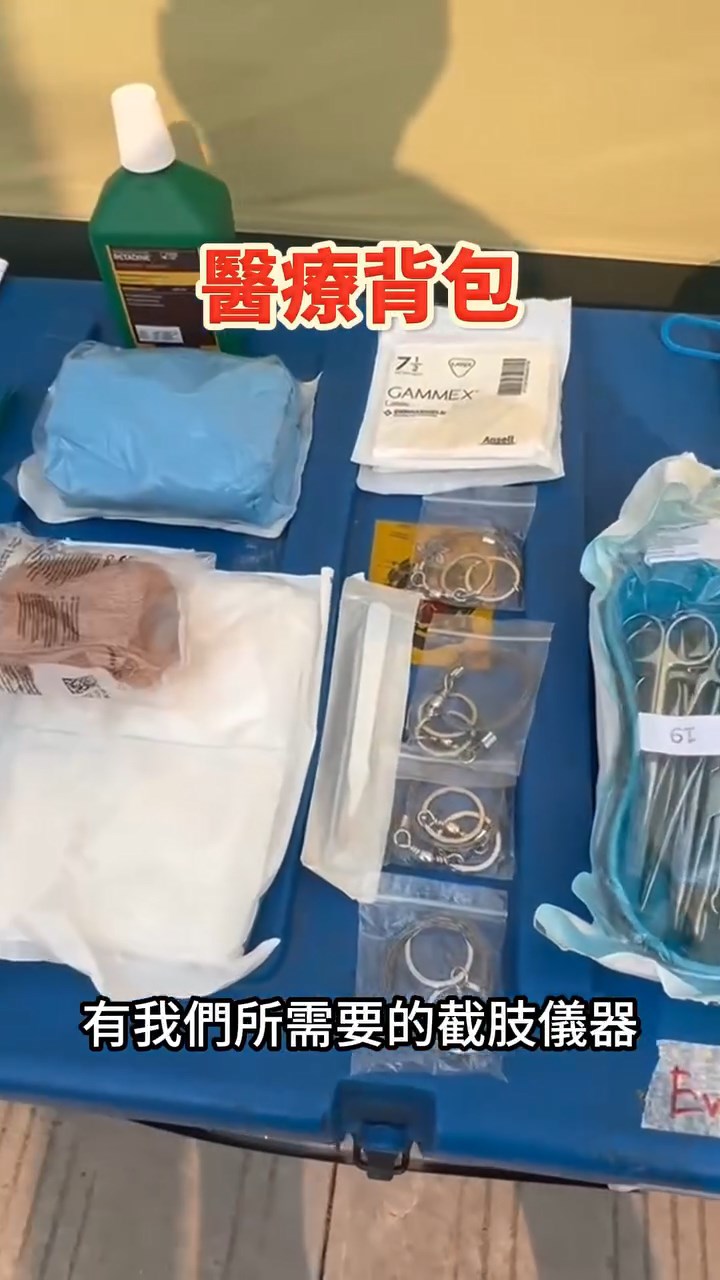 ▲醫(yī)療團(tuán)隊(duì)出動(dòng)時(shí)所需的背囊,內(nèi)有截肢儀器及擠壓綜合癥所需的藥物。保安局FB片段截圖