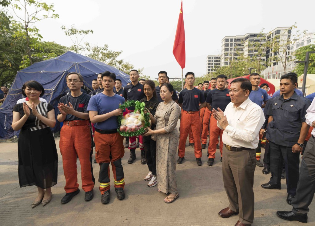 ▲緬甸領(lǐng)導(dǎo)人敏昂萊慰問中國救援隊(duì)伍。 新華社