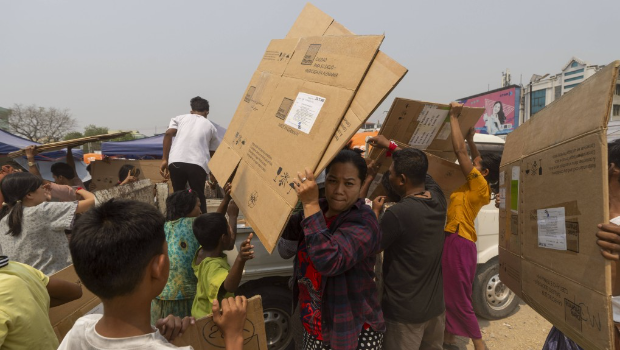 ▲在緬甸曼德勒醫(yī)學(xué)院附近的一處安置點(diǎn),人們領(lǐng)取可以用作臨時(shí)床鋪的紙殼。 新華社