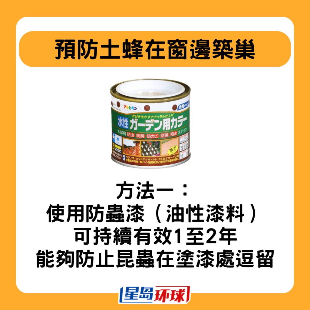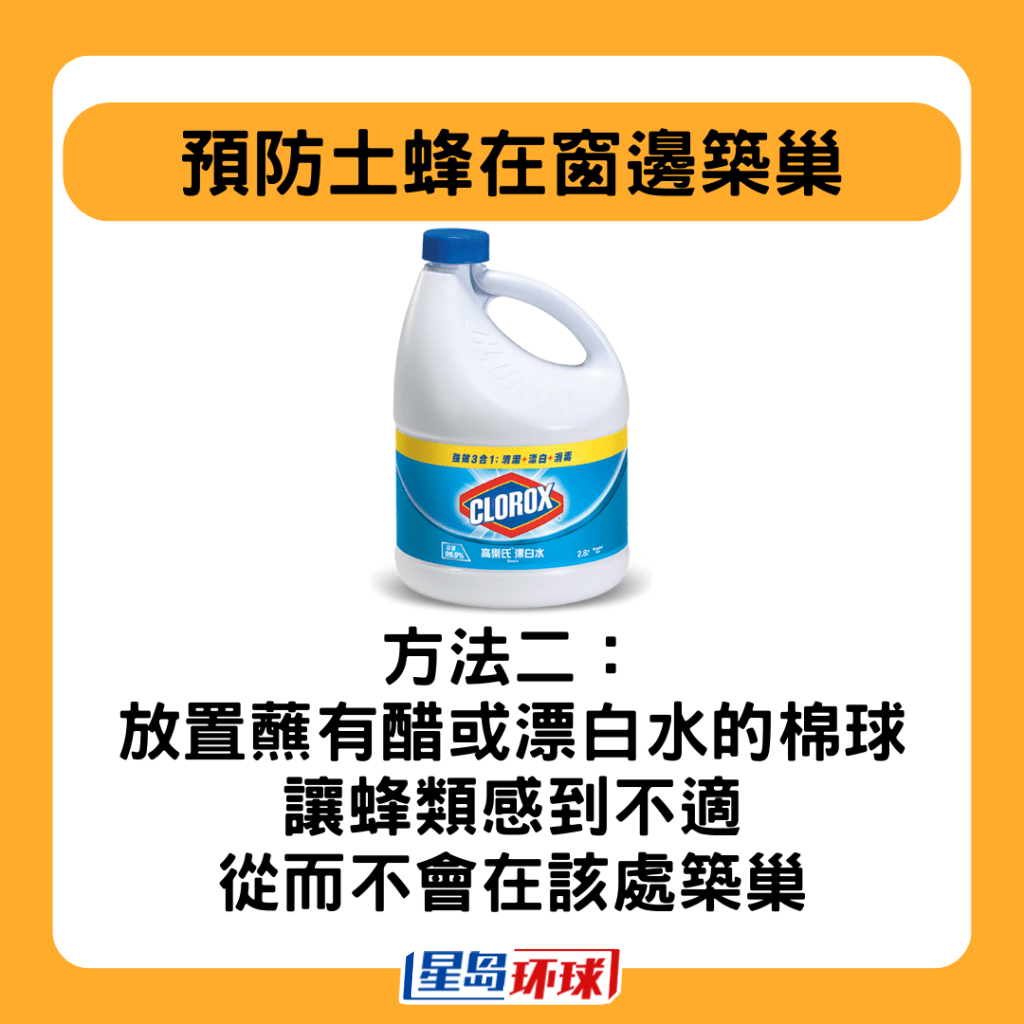 若要預(yù)防土蜂在窗邊筑巢,陳偉強(qiáng)列出兩種有效方法:一是使用防蟲漆(油性漆料),這種漆料可以持續(xù)有效1至2年,能夠防止昆蟲在涂漆處逗留;二是在窗邊放置蘸有醋或漂白水的棉球,這些氣味會(huì)讓蜂類感到不適,從而不會(huì)在該處筑巢。另外,住戶亦可多加巡視居家環(huán)境,或請(qǐng)管理公司仔細(xì)檢查外墻是否有蜂巢。