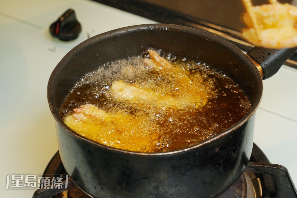 將蝦放進約70度的熱油中,炸至金黃色,取出。