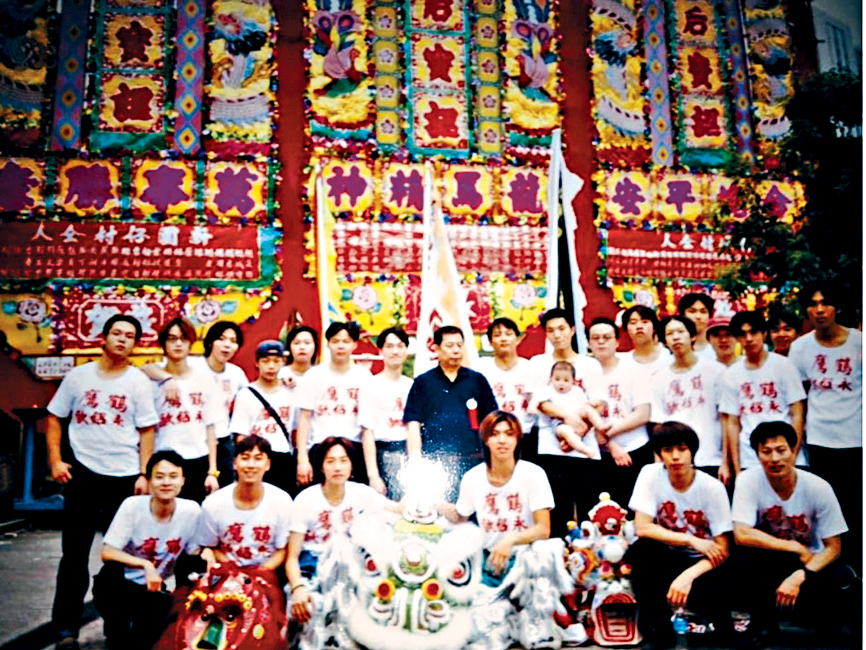 ▲90年代,鐘浩聲于表演后,抱著兒子跟歐紹永師傅及師兄弟合照。