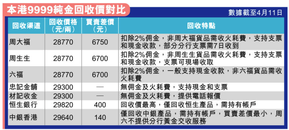 銀行雖然黃金回收價最高,但并非來者不拒,只收獲香港黃金交易所認(rèn)證五両或以上的足金金條及自家產(chǎn)品,老字號金鋪與連鎖珠寶金行均來者不拒,惟后者除了須額外扣除2%傭金,而非自家貨品還需額外扣除火耗,故賣金都要格價,隨時多一萬幾千元落袋。