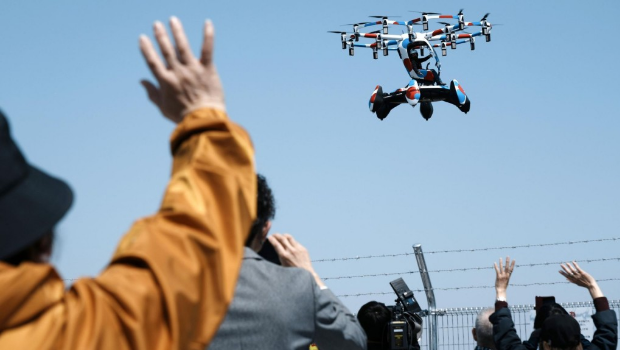 ▲“空中飛行車”在大阪世博第2天首次展示飛行 。 路透社