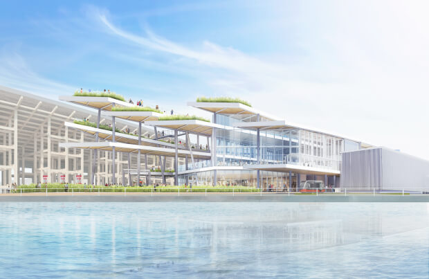 國際交流廳由創(chuàng)立百年的安井建筑事務(wù)所和以綠建筑聞名的平田晃久建筑事務(wù)所聯(lián)合設(shè)計(jì),多層次結(jié)構(gòu)模擬自然地形,戶外空間與室內(nèi)場(chǎng)館交融,綠意盎然的植物點(diǎn)綴其中,搭配大面積玻璃與植生墻,營建自然氛圍。