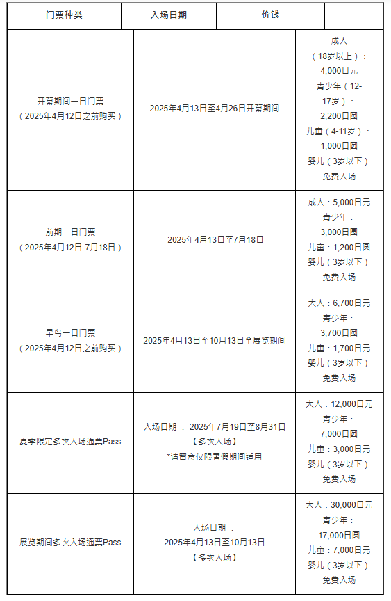 2025大阪萬博門票主要采用“電子門票”方式,于官網(wǎng)即可購買。于官網(wǎng)注冊(cè)及登錄“萬博ID”即可線上購買門票。購票后可選擇想要前往的日期(參觀日期預(yù)約可于預(yù)定參觀日期前6個(gè)月開始預(yù)約)當(dāng)日出示QR CODE即可入場(chǎng)。現(xiàn)場(chǎng)亦設(shè)有柜臺(tái)提供即場(chǎng)購票,不過額滿即止,而且無法提早預(yù)約場(chǎng)館,建議有興趣前往的大家預(yù)先買好門票。