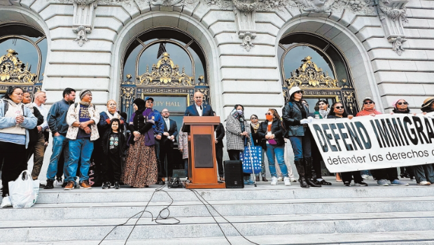 正值報(bào)稅截止日,舊金山多位民選官員、移民權(quán)益組織與公設(shè)辯護(hù)人辦公室周二中午在市府前集會(huì),譴責(zé)聯(lián)邦政府國(guó)稅局(IRS)及移民與海關(guān)執(zhí)法局(ICE)之間的合作協(xié)議,并聲援受到壓力的移民群體。