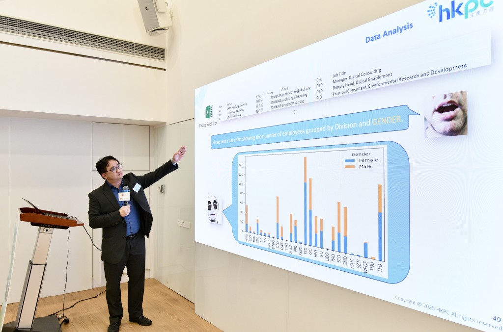 工作坊當日邀請了兩位星級嘉賓進行專題演講,其中團結(jié)香港基金公共政策研究院研究員謝穎昕,以“政策引領(lǐng)綠色轉(zhuǎn)型”為題,探討政策對企業(yè)實踐ESG目標的影響,并分析如何在政策支持下協(xié)助企業(yè)綠色轉(zhuǎn)型。緊接是香港生產(chǎn)力促進局綠色生活與創(chuàng)新部環(huán)??萍佳邪l(fā)首席顧問盧志偉以“ESG X AI實戰(zhàn)案例”為題,分享了AI技術(shù)在ESG數(shù)據(jù)分析中的應(yīng)用案例,以及如何利用AI人工智能協(xié)助企業(yè)提升ESG表現(xiàn)。