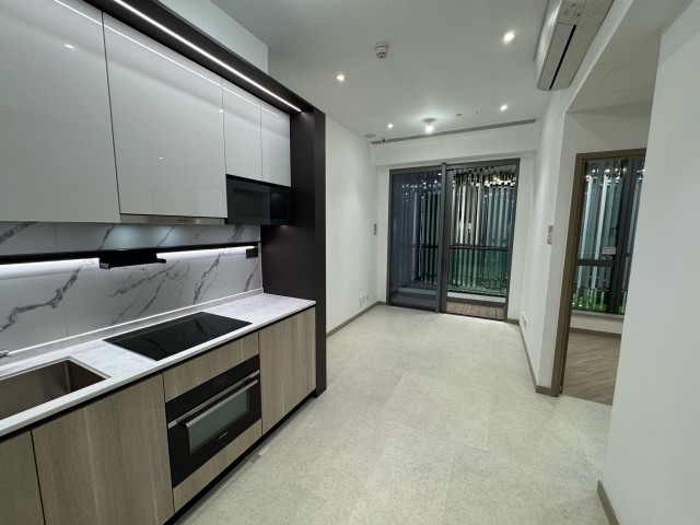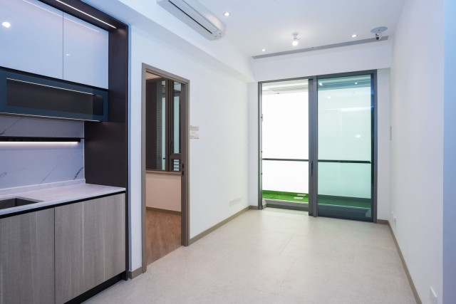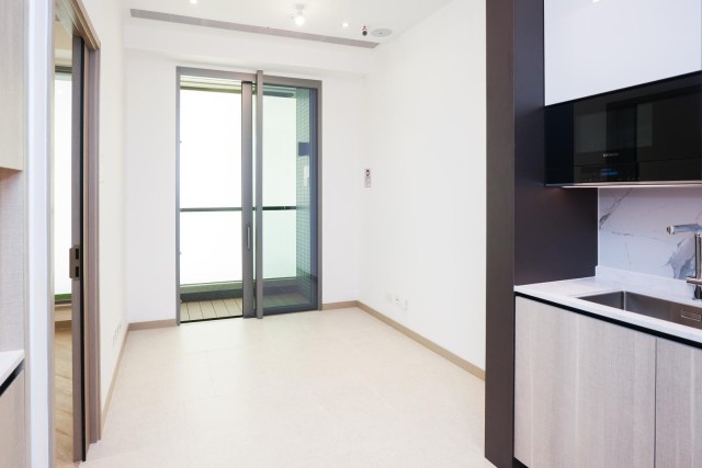 另一間以參照1座10樓J室打造的2房示范單位,屬交樓標準,單位大門旁同樣設(shè)有收納柜,采開放式廚房,“L”字形廚柜提供不少收納空間,大廳方正實用,外接面積27方呎露臺,兩間睡房同樣方正,亦設(shè)有近落地大窗,采光度不俗,主人房設(shè)有工作平臺。