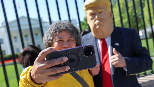美國(guó)華府白宮圍墻外本月9日有表演工作者模仿特朗普,吸引游客合照。