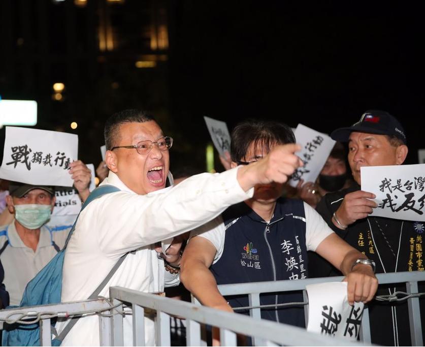 檢調(diào)偵辦罷免死亡連署案,國民黨支持者17日晚間聚集在北檢外,高喊口號抗議。