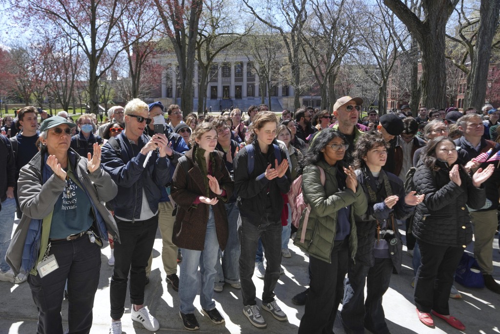 哈佛學(xué)生、校友及教職員在校園集會,不滿特朗普政府干預(yù)學(xué)術(shù)自由。 美聯(lián)社
