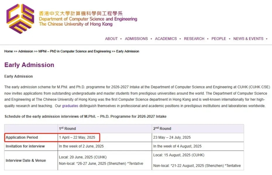 除了商學(xué)院,香港中文大學(xué)計(jì)算機(jī)科學(xué)與工程系預(yù)計(jì)也將于近期開(kāi)放26fall提前批申請(qǐng)。