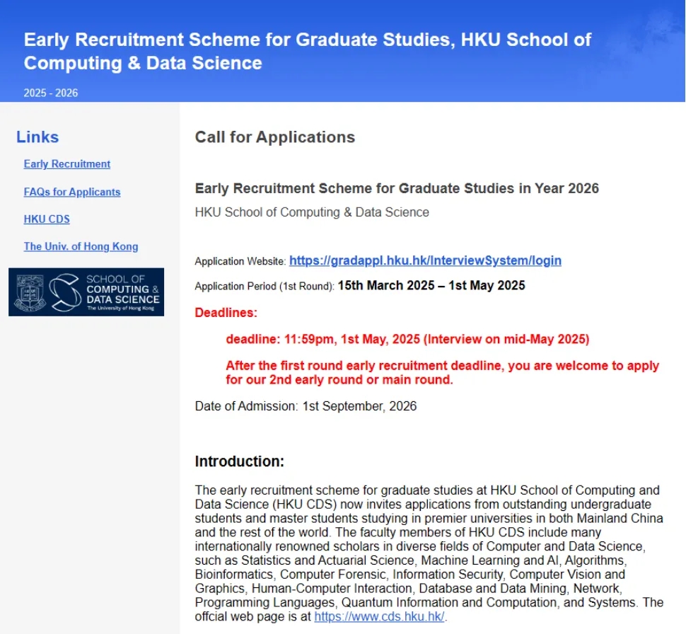 有些同學(xué)還在等港校25fall offer,香港大學(xué)計(jì)算機(jī)與數(shù)據(jù)科學(xué)學(xué)院26fall提前批卻已經(jīng)“偷偷”開(kāi)申!