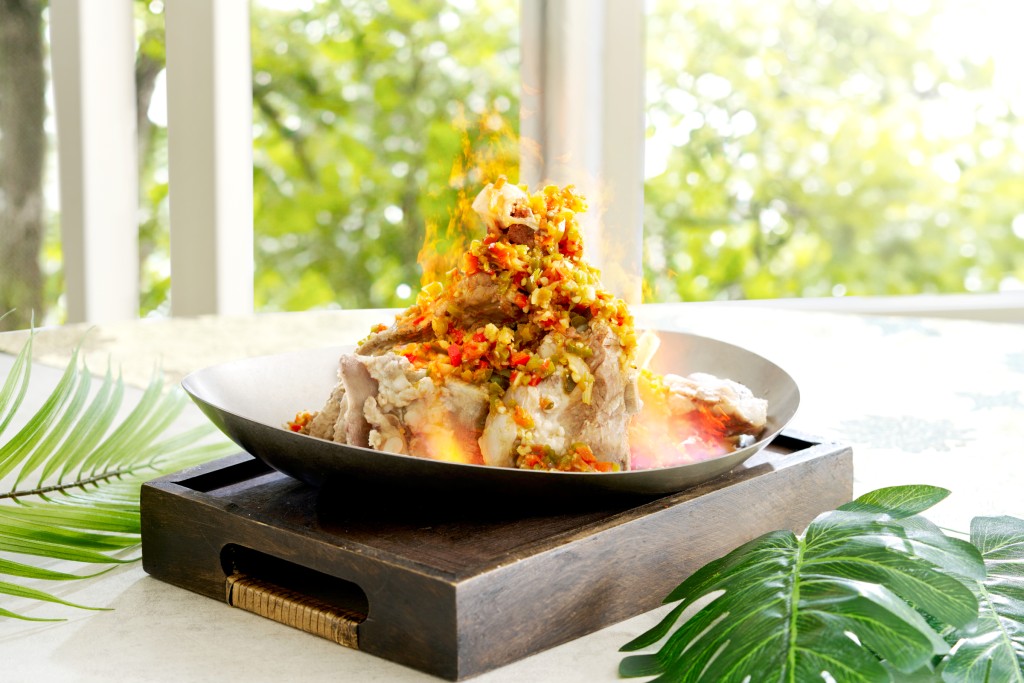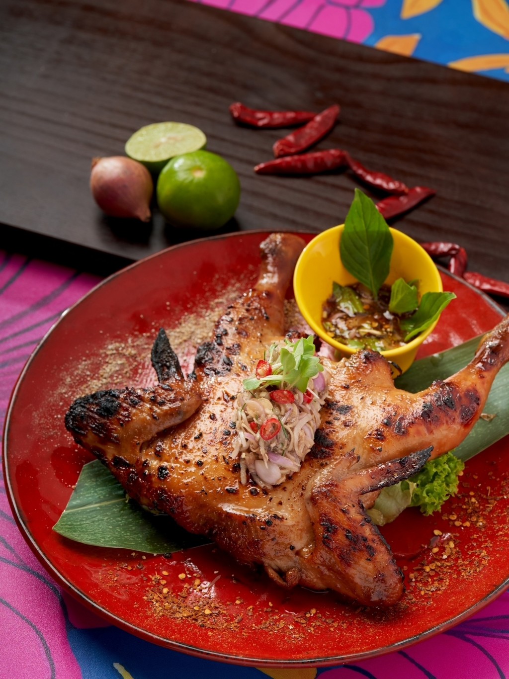 惹味的烤豬腩肉配辣蝦醬,是用辣椒、干蔥、蒜頭、西紅柿及甜醬油等調(diào)味,經(jīng)過慢煮及燒烤工序,令豬腩肉吃起來豐腴滋味卻不肥膩。泰式原只燒春雞用椰糖、芫荽頭等腌過再燒,伴香茅南姜醬汁、干蔥碎、檸檬葉及香茅吃,肉質(zhì)嫩滑鮮美,別具地道泰菜風味。