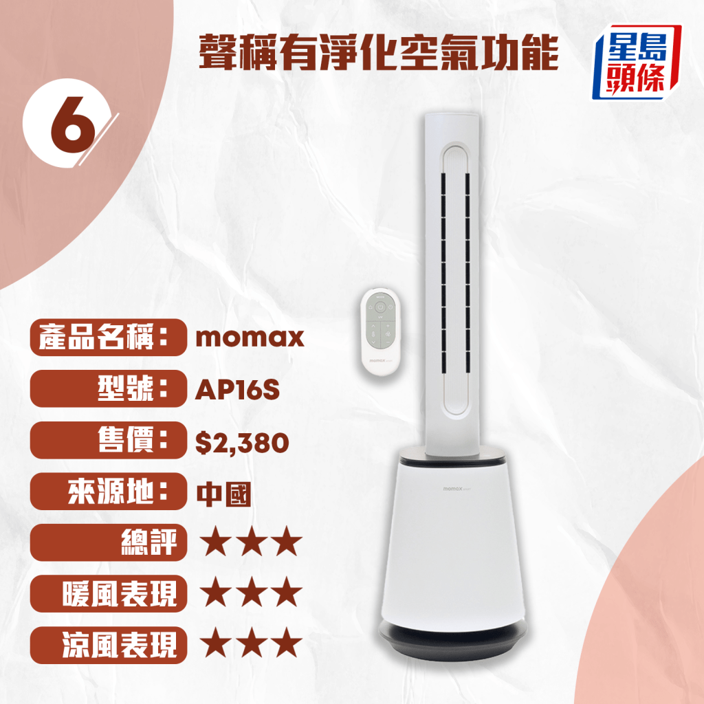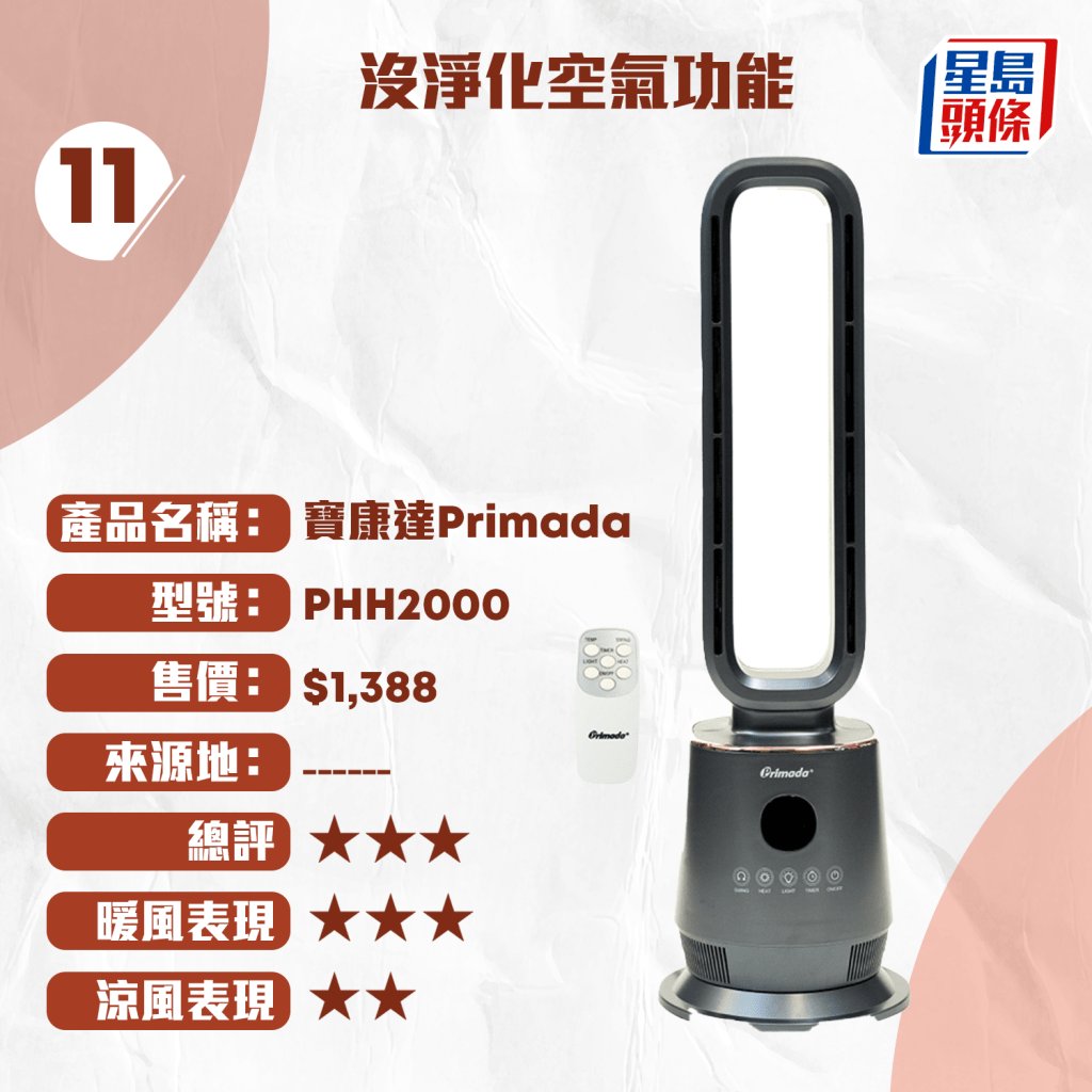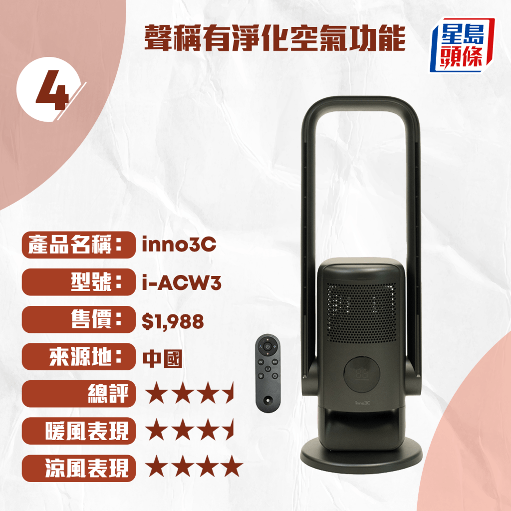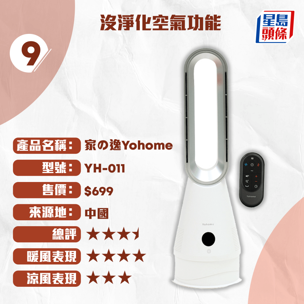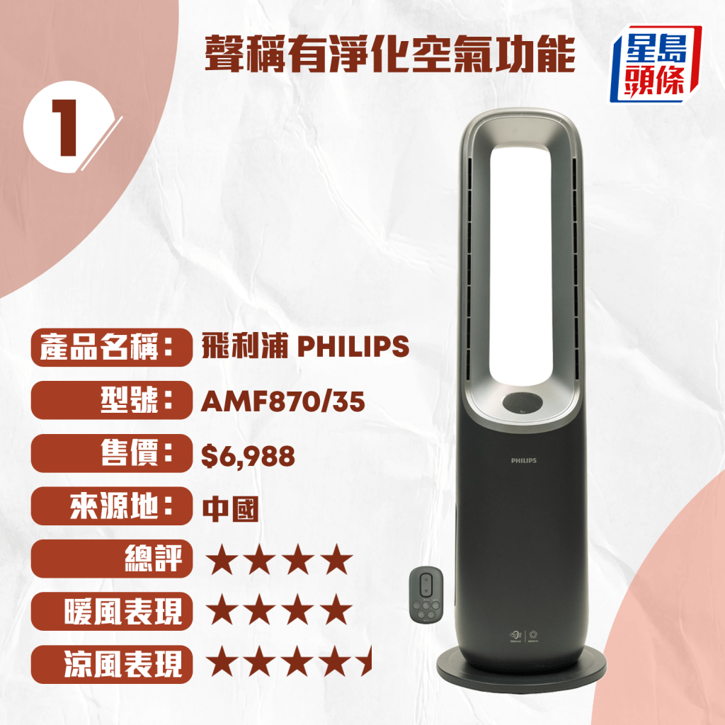 測試中,4款風(fēng)扇獲得4星評分,包括售價(jià)最高的“飛利浦 PHILIPS”冷暖無葉風(fēng)扇($6,988)、“dyson”($4,480)、“德國寶 German Pool”($1,980)及“Power Living”($1,598)。其中,“飛利浦 PHILIPS”與“dyson”配備HEPA過濾器,且送風(fēng)量及加熱速度表現(xiàn)優(yōu)秀。而最平價(jià)的“家の逸 Yohome”冷暖無葉風(fēng)扇($699)則獲3星半評分,性價(jià)比媲美售價(jià)$4,990的“LG”風(fēng)扇。