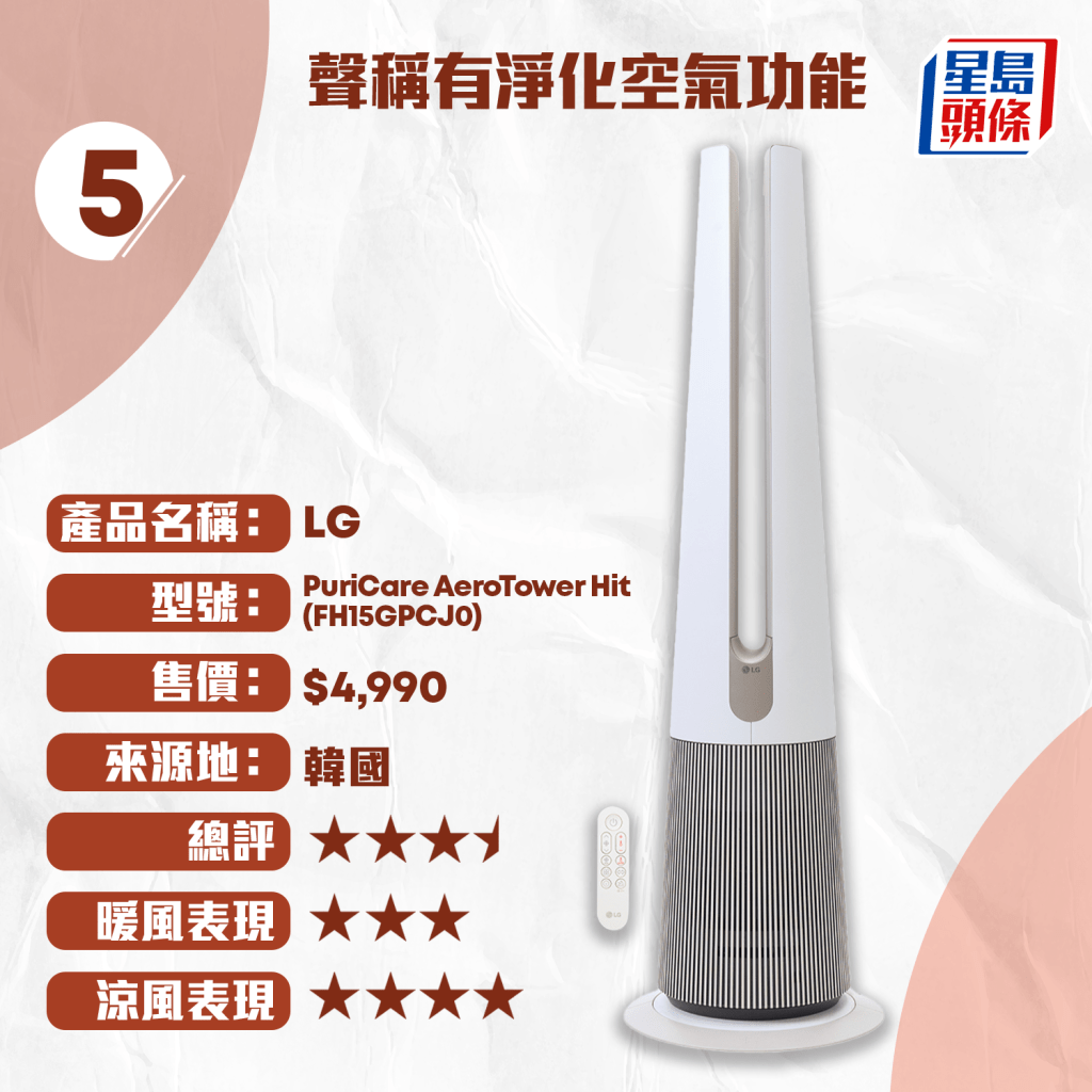 5.LG / PuriCare AeroTower Hit (FH15GPCJ0) / $4,990 / 3.5星