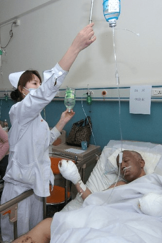 ▲護士正在護理25歲的傷者李曉東。新華社